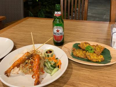 インドネシア定番のナシゴレンとビンタンビールとトウモロコシの料理を食べました。