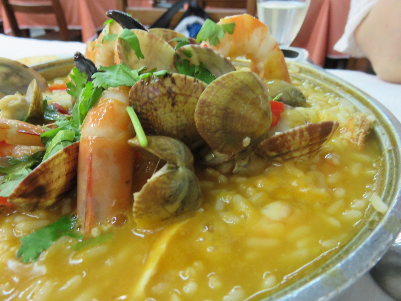 リスボンでのシーフードでは、質、量ともに一番でした。ガイドブックにも載っているので観光客ずれしてるのかな?と心配してましたが決してそんなことなく、上にはエビやあさり、リゾットの中にはロブスターや蟹がゴロゴロと贅沢シーフードが盛りだくさんのシーフードリゾット(アローシュ・デ・マリスコ ArrozdeMarisco)2014年7月€29、5。これと白ワインの小瓶二人が満腹になりました。