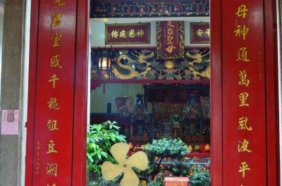細いアーケードには、みやげ物やアートの店などが沢山並んでいます。同じみやげ物でもチムシャツイのバラマキ用とは一味違う品揃え。ただ最近はオールドチャイナっぽい商品の店が減少気味で、現代風にアレンジされた商品が多くなってきたみたい。アーケードを抜けると今度はいきなり南欧風のレストランが並びその先には現代的に変身した赤柱市場が。新旧ゴッチャな香港の縮小版。その先の廟をみると少しほっとさせられます。