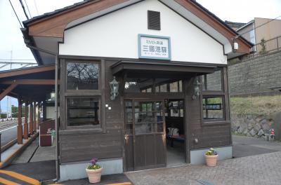 駅のまえには三国港が広がり、近くには三国温泉や東尋坊を控えるえちぜん鉄道の最終駅です。環境は決して鄙びていませんが、駅舎は何か郷愁を感じさせる無人駅です。朝の福井行を待ちましたが、同舟の方は我々の他に学生さんと地元のお母さん2人。バスのターミナルのあるとなりの三国駅に比べてアクセスが落ちるのか最終駅にしては、主役の感はありません。