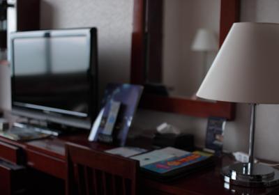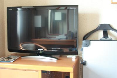 部屋にはTVとその下に空の冷蔵庫、湯沸しポットとお茶のティーパック、湯呑みとコップ。ビジネスホテルっぽくズボンプレッサーまで。