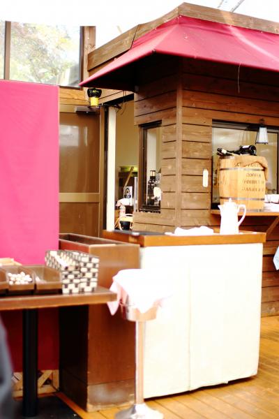 中は室内席とテラス席があります。テラス席にも本当に外の席と温室のように囲まれた暖かい席があり、この日は寒い日だったので温室のようなテラス席に。目の前に女神湖が広がります。