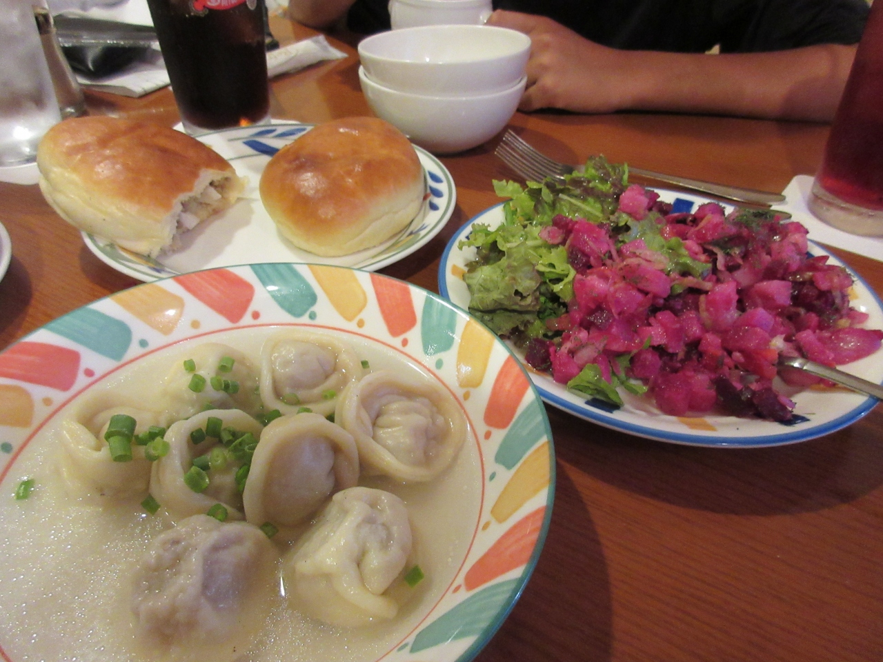 子供用に「チャイカセット」をふたつと大人にはアラカルトで肉のプレート(ウズベク風焼き肉=ラム、チェフチェリ=お米入り牛肉のミートボール)をふたつ頼んだ。