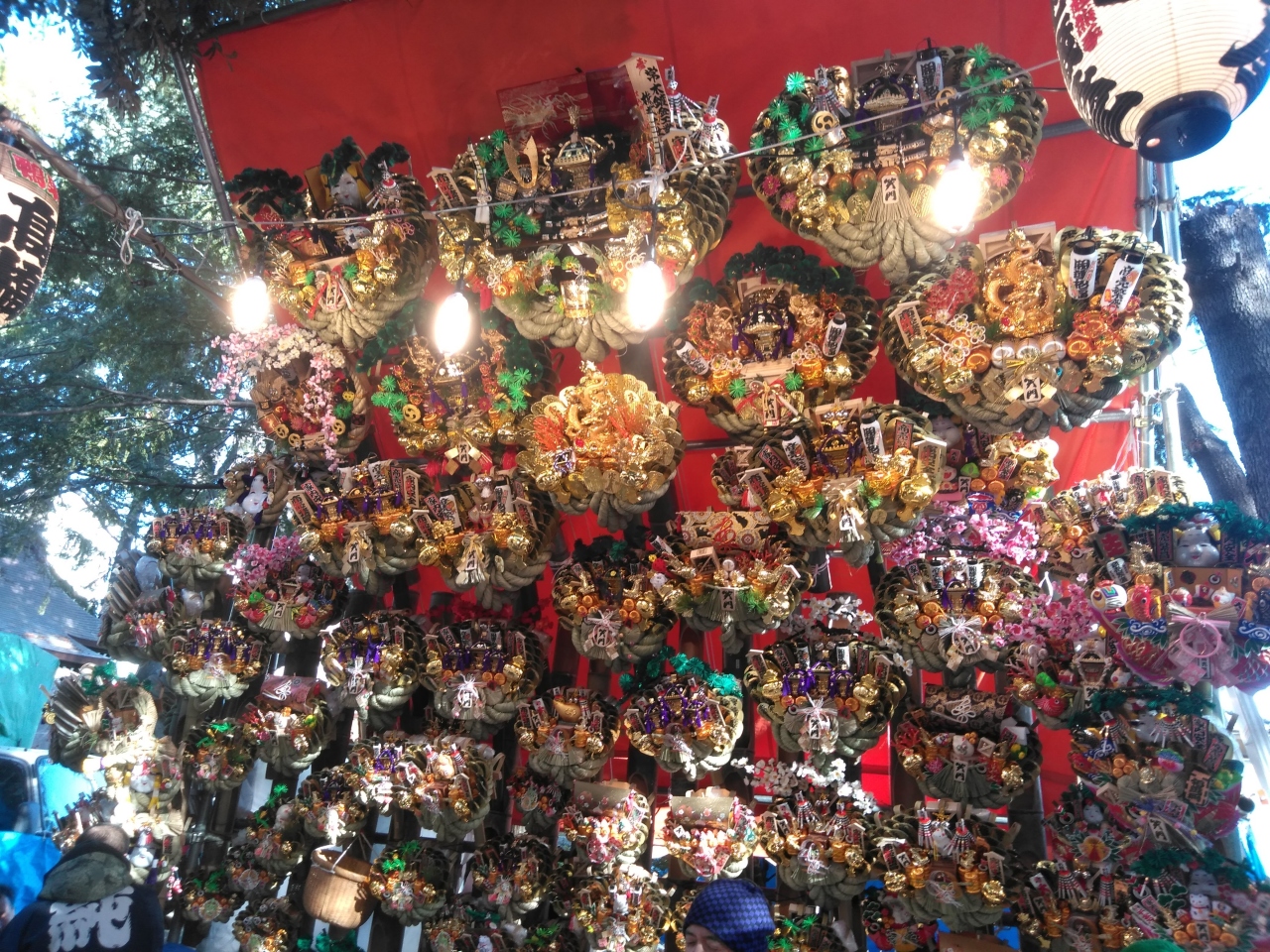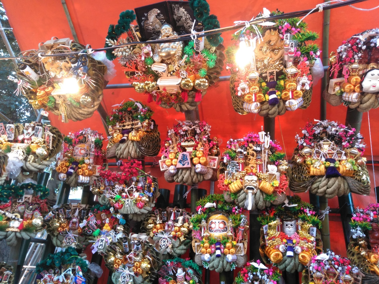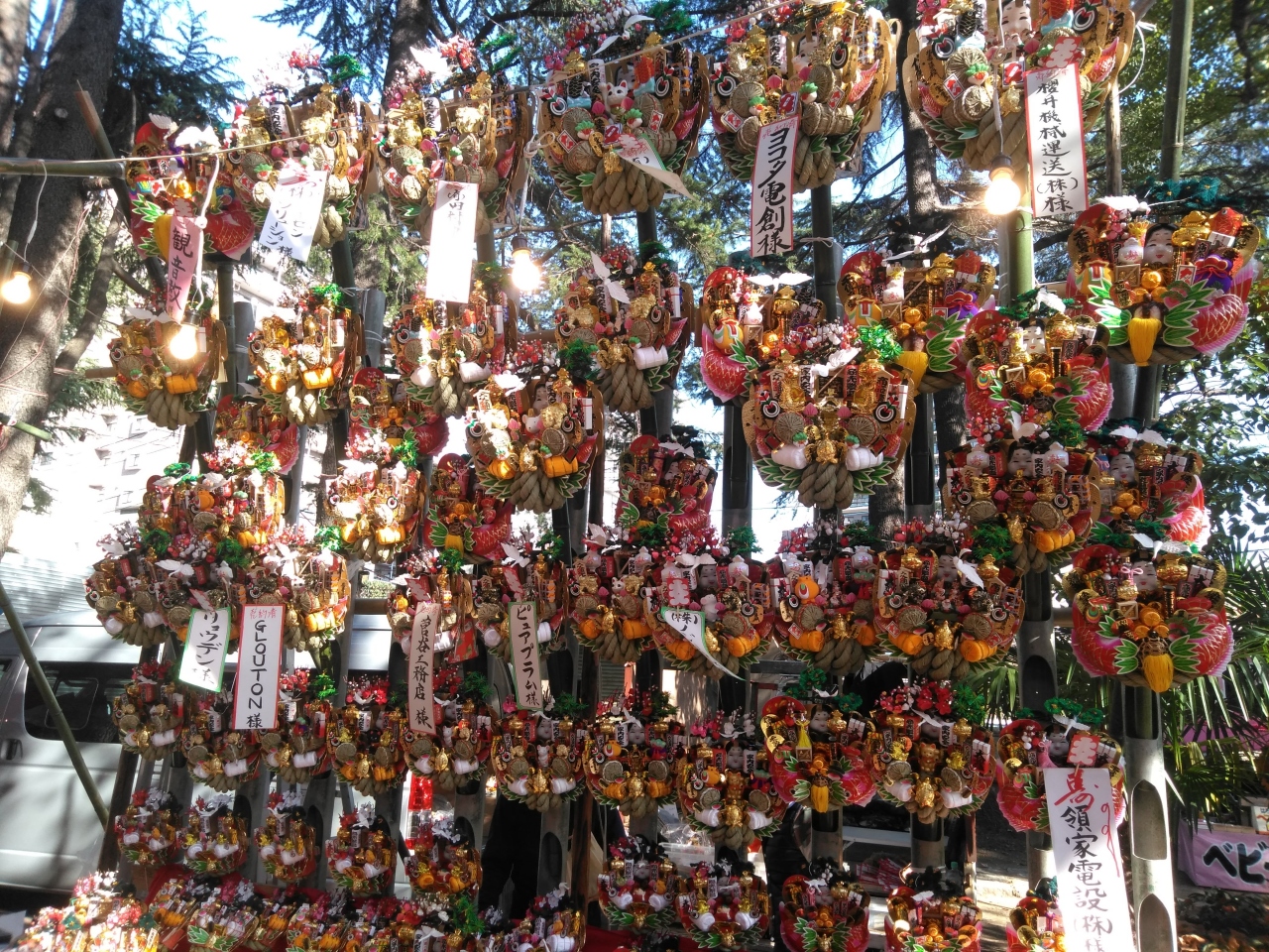 毎年12月15日は、おかめ市です。おかめ市は、熊手を売っている酉の市です。神社の境内には飾られた熊手を売っています。年の瀬を味わえます。