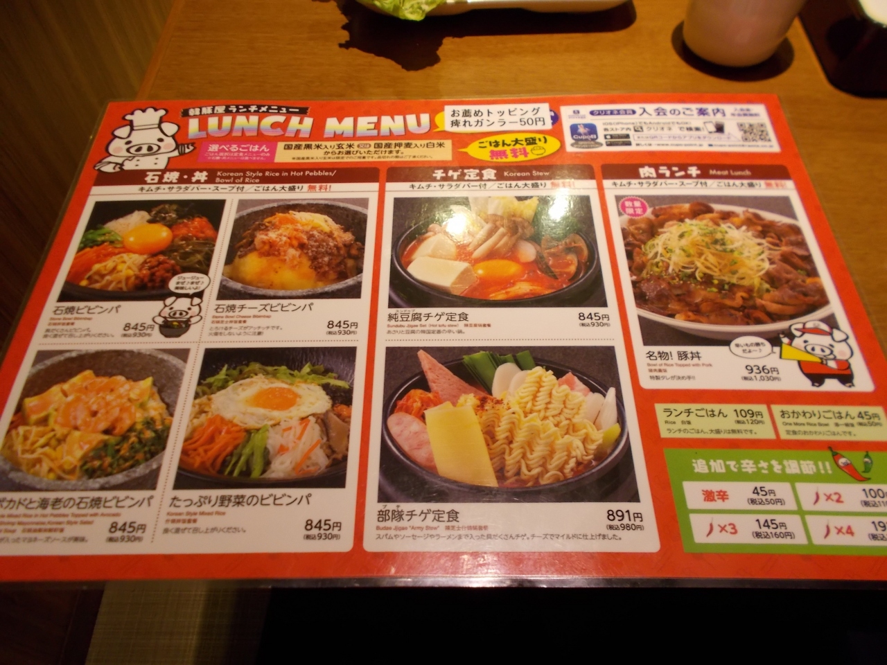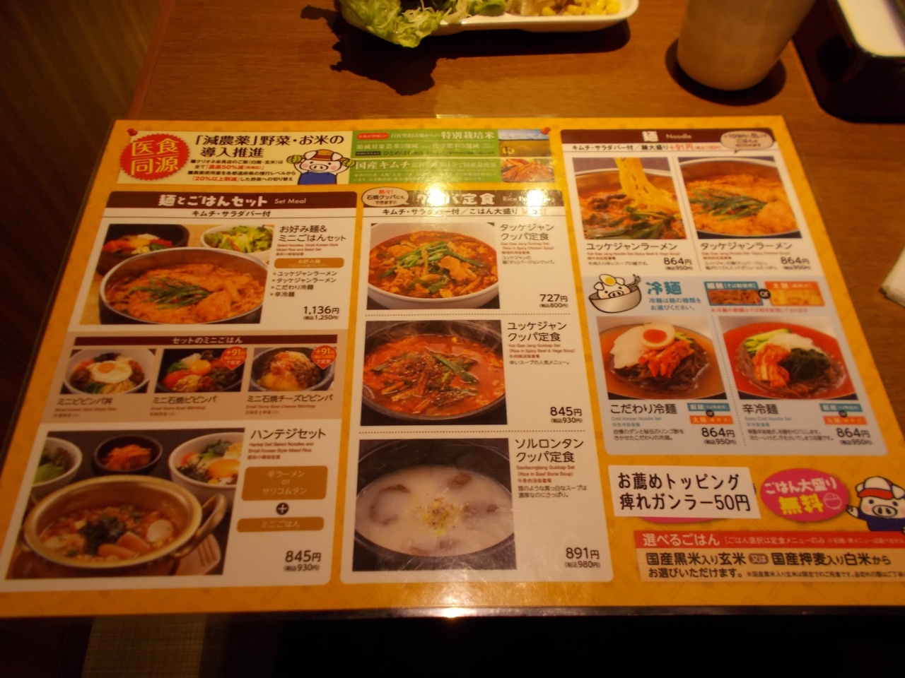 またランチメニューがあります。サラダ・バーも付いてお手頃の価格で食べられます。ユッケジャンクッパ定食を食べたのですが、辛さはマイルドでした。また、きてみたいと思いました。