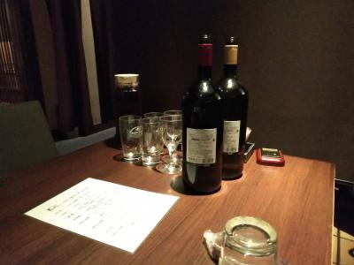 夜の時間、飲み放題コースで訪問をしました。席は、半個室の形態で他のお客様を気にしない感じです。テーブルには、飲み放題コースで、ワインボトルが赤/白の太いボトルに、ウーロン茶が用意されていました。頼まず飲める形態です。料理は、まぁ満足いけるレベルでした。