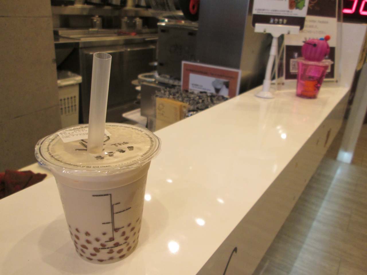 台湾でみるタピオカミルクティー。沖縄の国際通りにあります。台湾だと頼むのに指でさして頼みますが、日本語で大丈夫です。またラッピングは蓋でなく、台湾形式にビニール張り付ける形式です。本場のタピオカミルクティーを感じます。