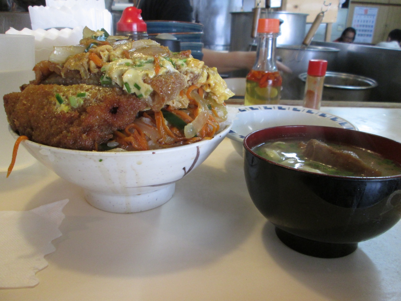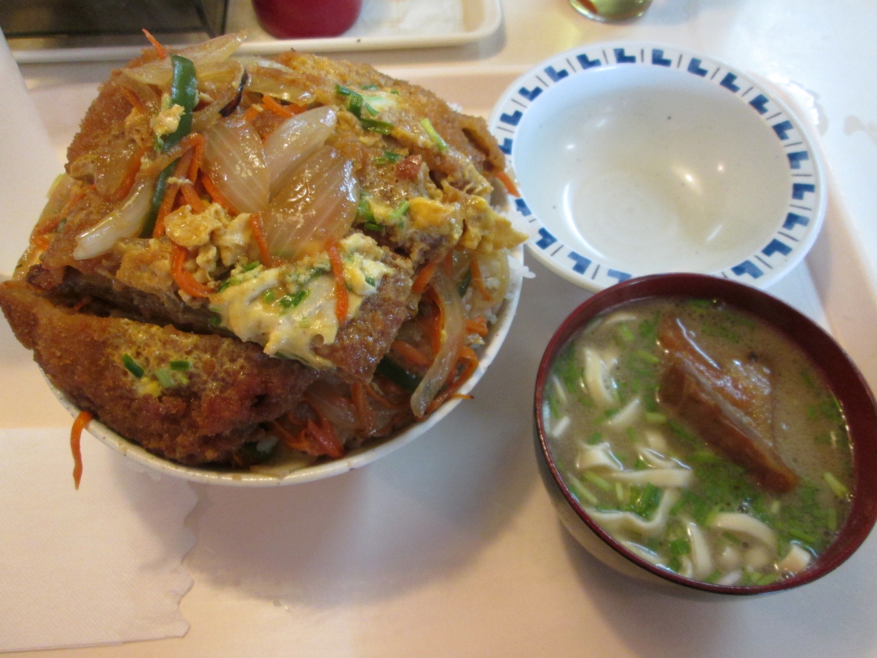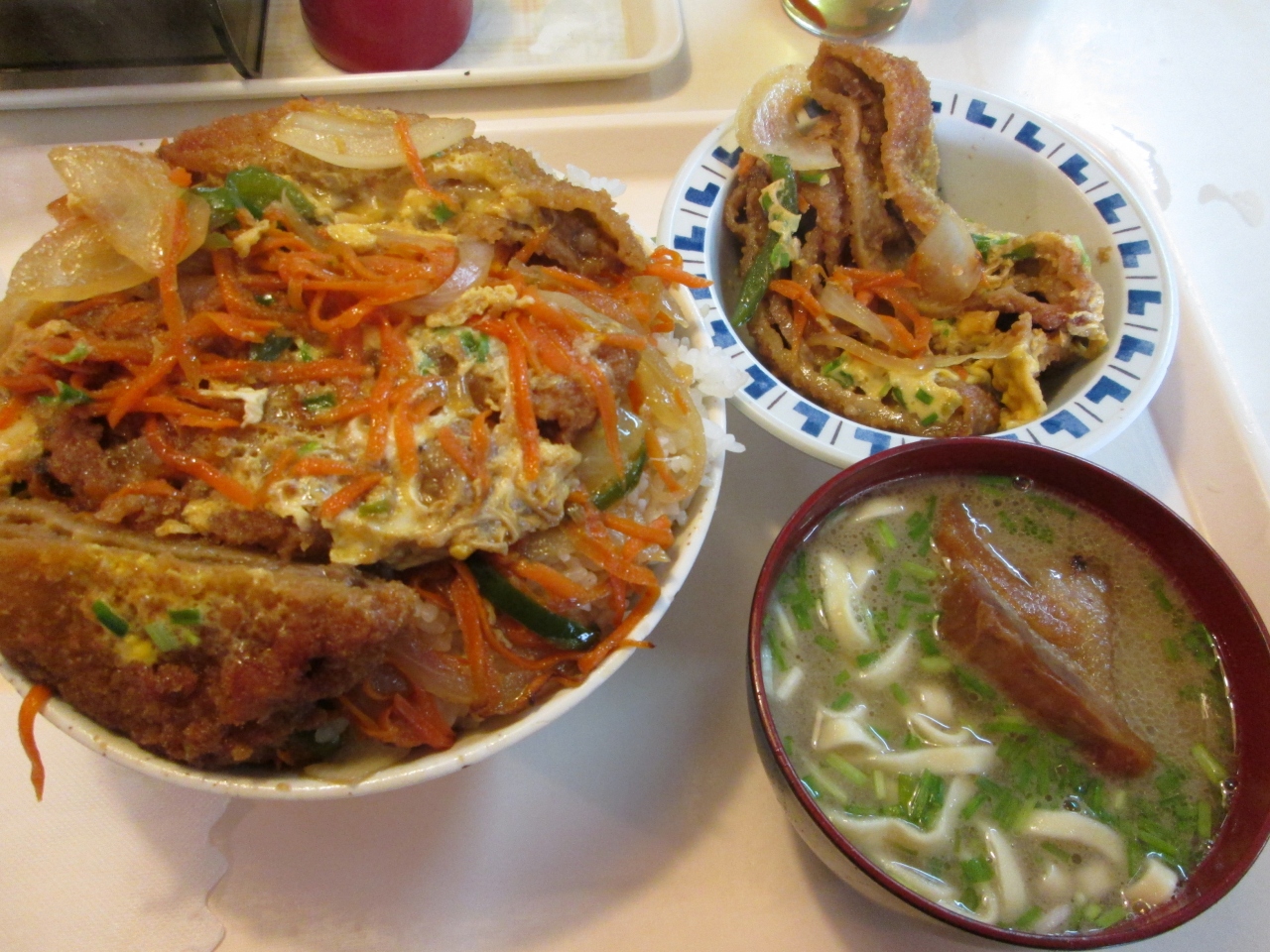 こんかいかつ丼を食べました。デカ盛り、カツが2枚に沖縄らしく野菜が入っているかつ丼、野菜は、青菜が入っているところが多いけど、ニンジン、ピーマンが入っていました。