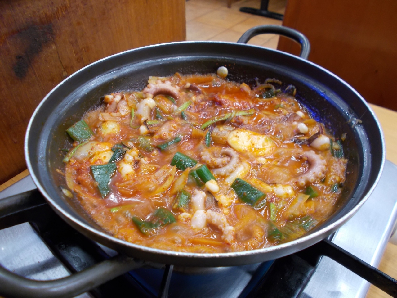 外で焼かれていた焼き魚にさそわれてこの店へ。お店の外に店員に食べたい魚を指をさして、お店の人は、日本語で7,000wonと言われてお店の中へ。鍋でぐつぐつ汁物も付いていました。この汁物は辛いですが、ご飯にかけて美味しくいただけました。