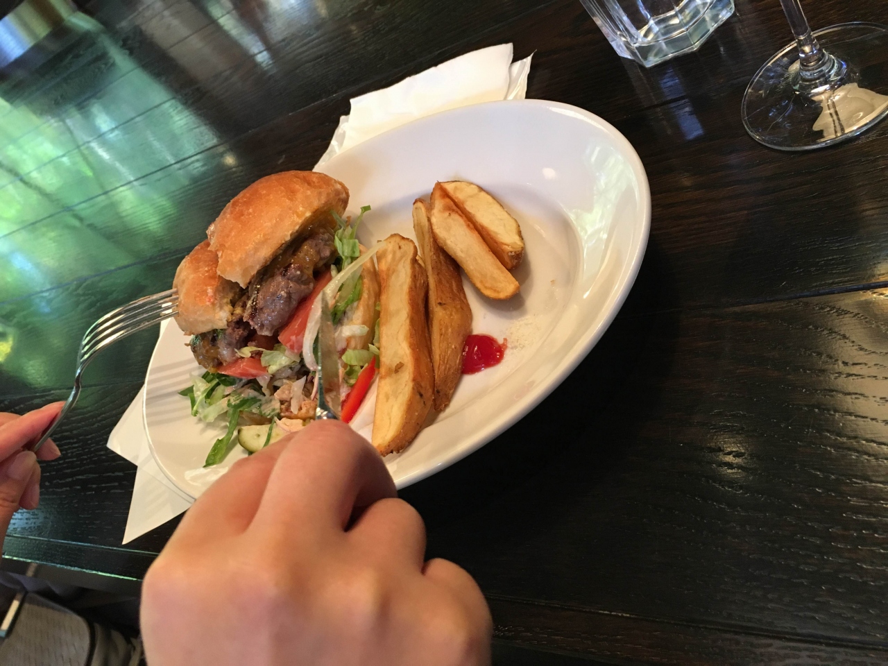 肉肉しいハンバーガーとスパークリングワインを注文。