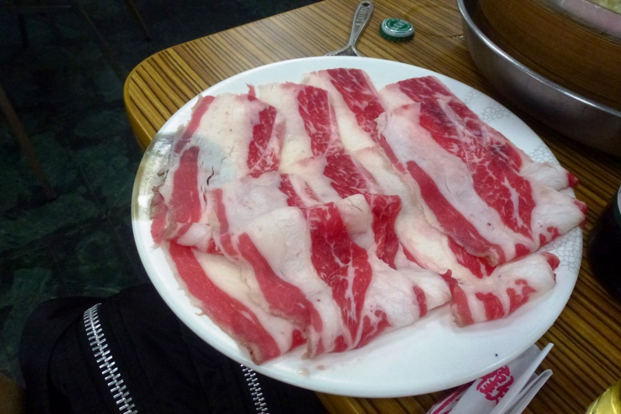 ただ、出てきた肉は食紅で着色されているようで、脂身の縁が火を通しても赤い色