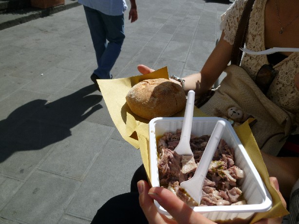 ランプレドットはフィレンツェの名物料理で、牛の第4 胃をメインにトマト、パセリ、セロリなどを塩コショウで煮込んだものだそうです。