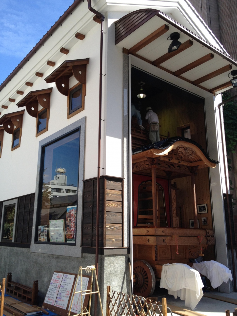 入口には山車が飾ってある山車蔵があります。この日は修理?していました。