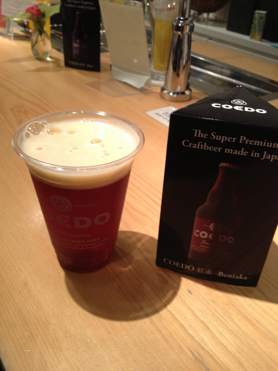 ビンや缶でCOEDOビールが売っているのとは別に、ビールサーバから入れてくれる生のCOEDOビールが売っていました。薩摩芋を使った紅赤がおススメとのことで飲んでみました。ほのかな薩摩芋の香りがたまりません。