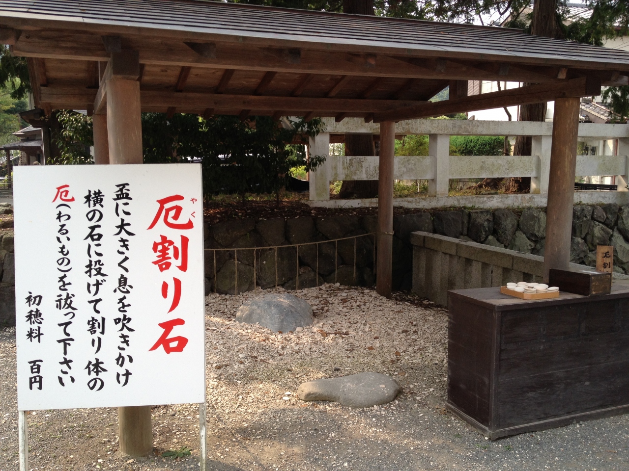 盃に息を吹きかけて石に投げて割り、体の厄を祓うことができる「厄割り石」があります。折角なのでためしてみました。