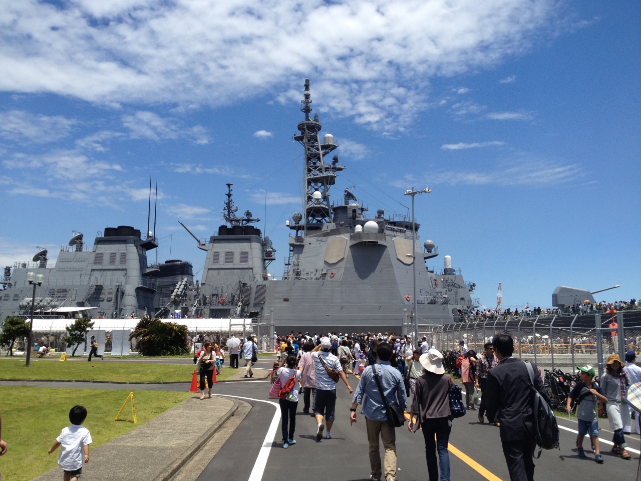 海上自衛隊では艦艇、ヘリの展示・一般公開を実施。海上自衛隊に入れるとあって人もいっぱいで混んでいました。日差しも強く艦艇の一般公開も行列でした。- 旅行時期