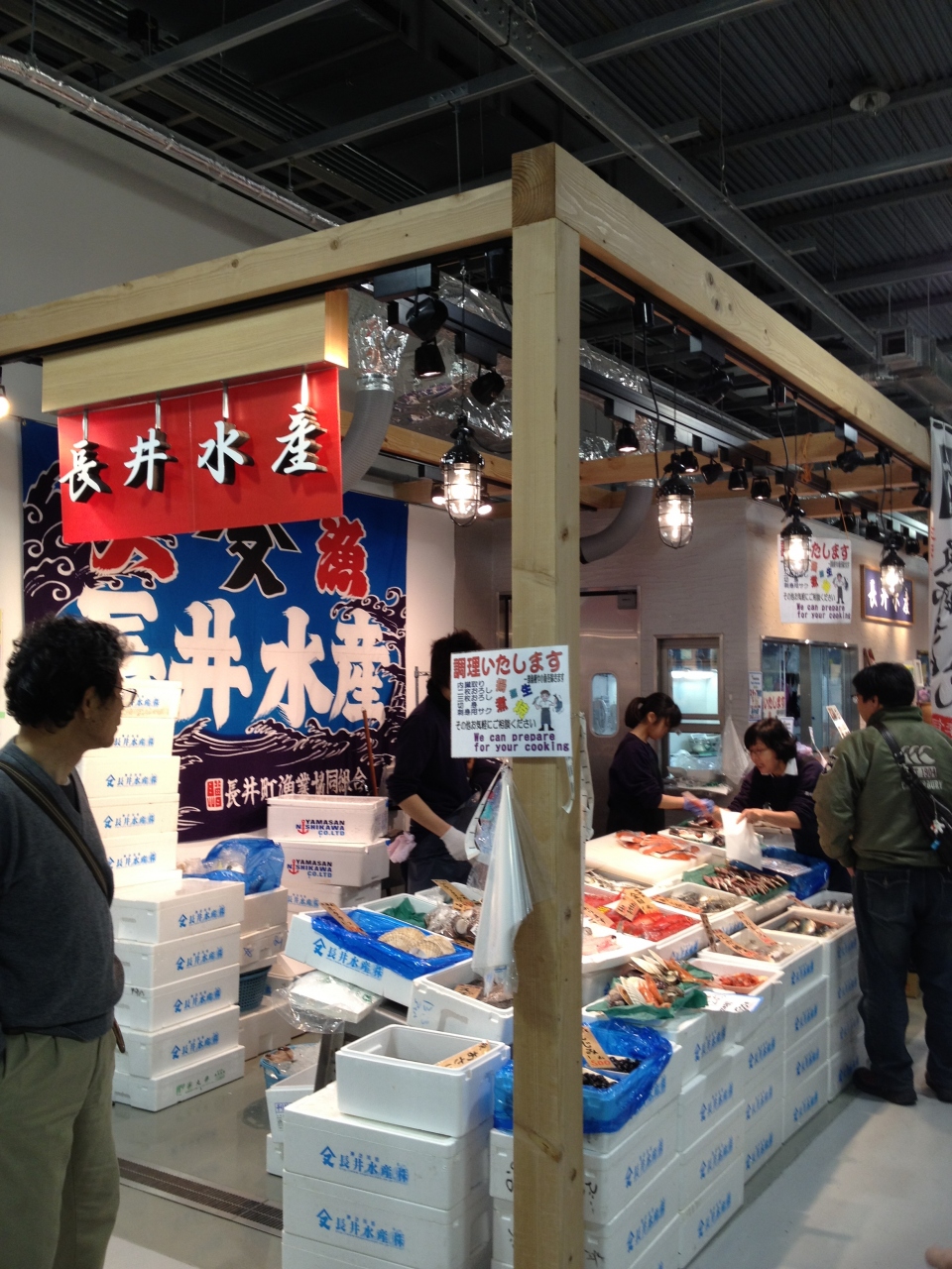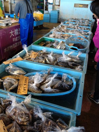 今の時期は魚の種類は少ないみたいで、アジ、イワシが主体で、アオリイカやカワハギなんかがいました。鮮魚、活魚が売ってます。
