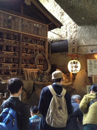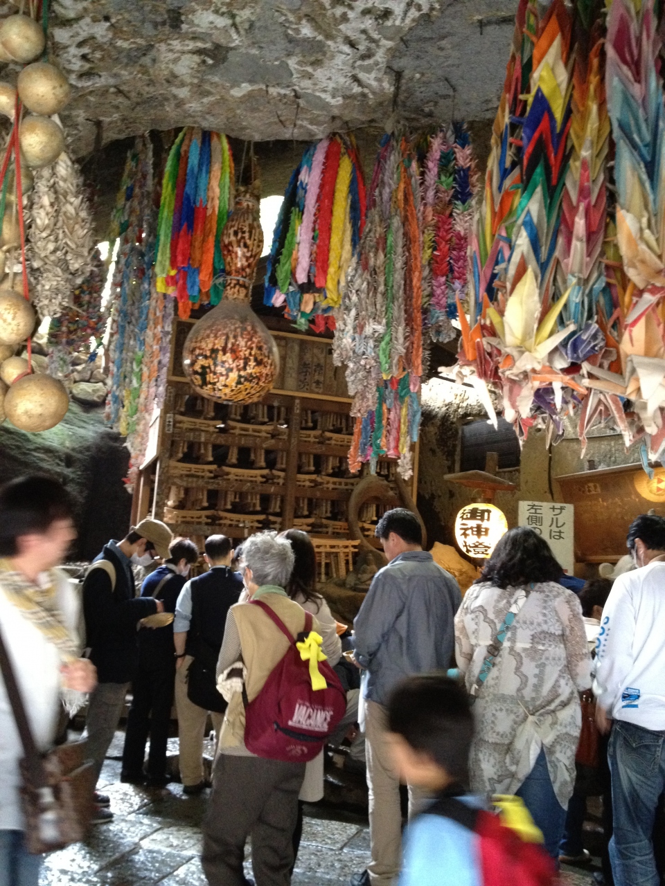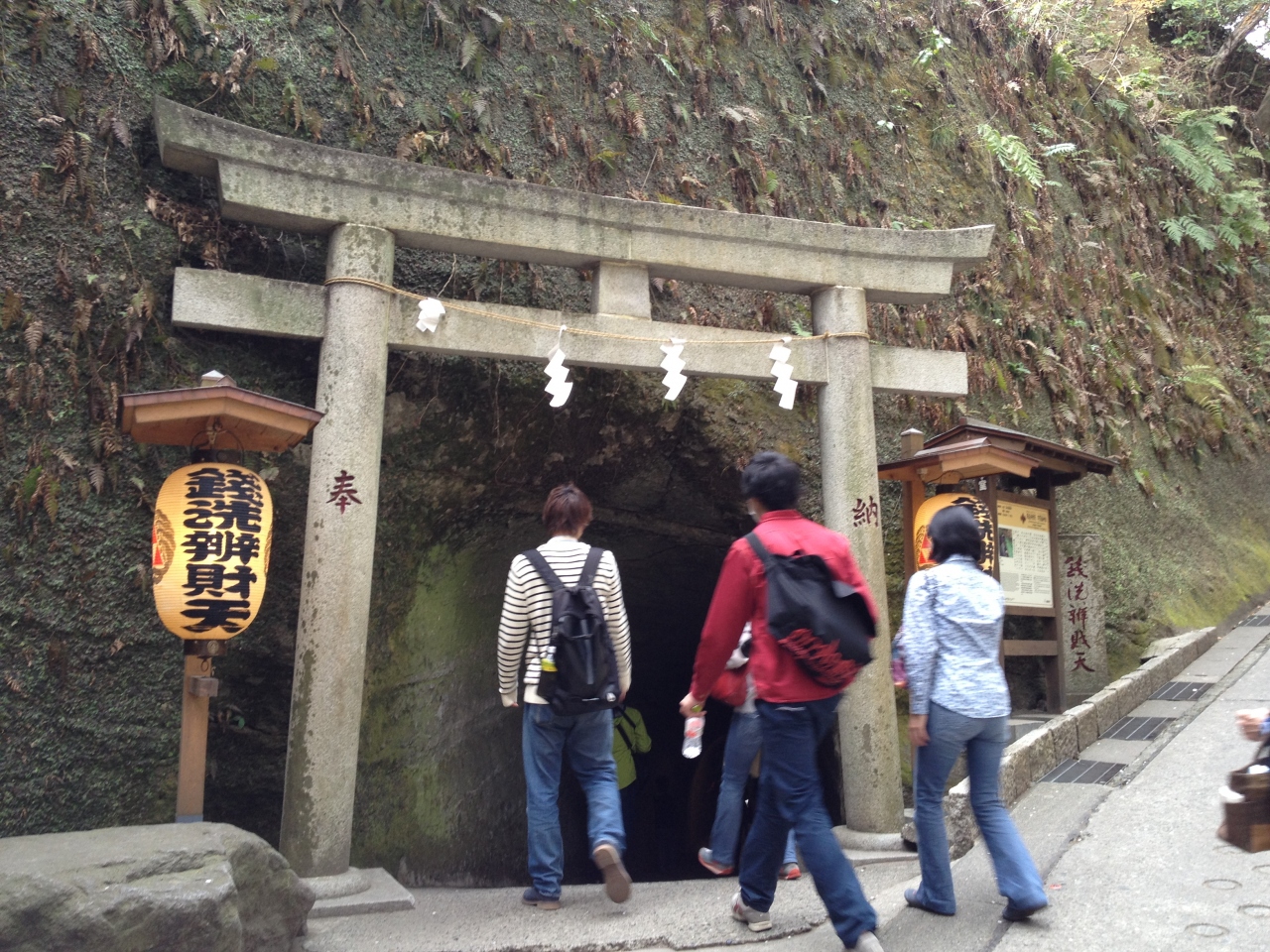 境内の奥の岩窟の中に名水・銭洗水の湧き出す奥宮があります。奥宮の中は千羽鶴が吊るしてあったりと独特の雰囲気が漂います。銭が倍になることを願って洗いました。