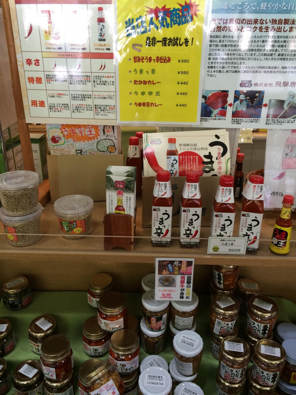 飛騨の特産(?)の「うま辛王」などの調味料や、さるぼぼのお菓子やグッズなども揃っていました。