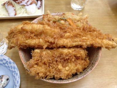 私はいつもアナゴ天丼!タレも美味しくて、なんといっても凄いボリューム。どんぶりからアナゴがはみ出ています。絶品です。