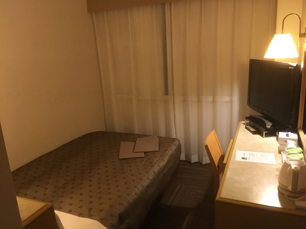 部屋はコンパクトな感じでしたが、必要な物は揃っていて、部屋の冷蔵庫に入ってたドリンクはフリーだったので、ありがたかったです。