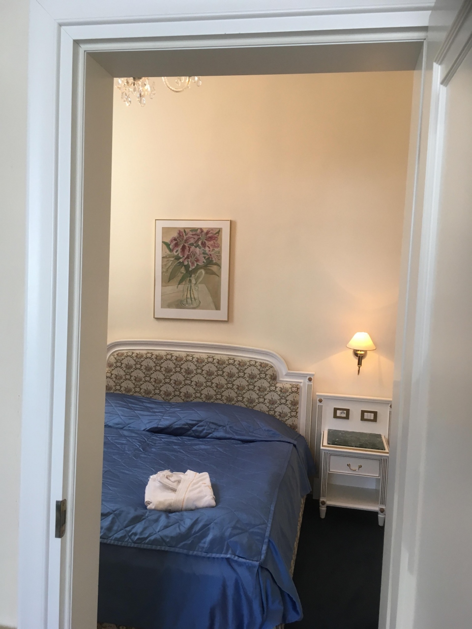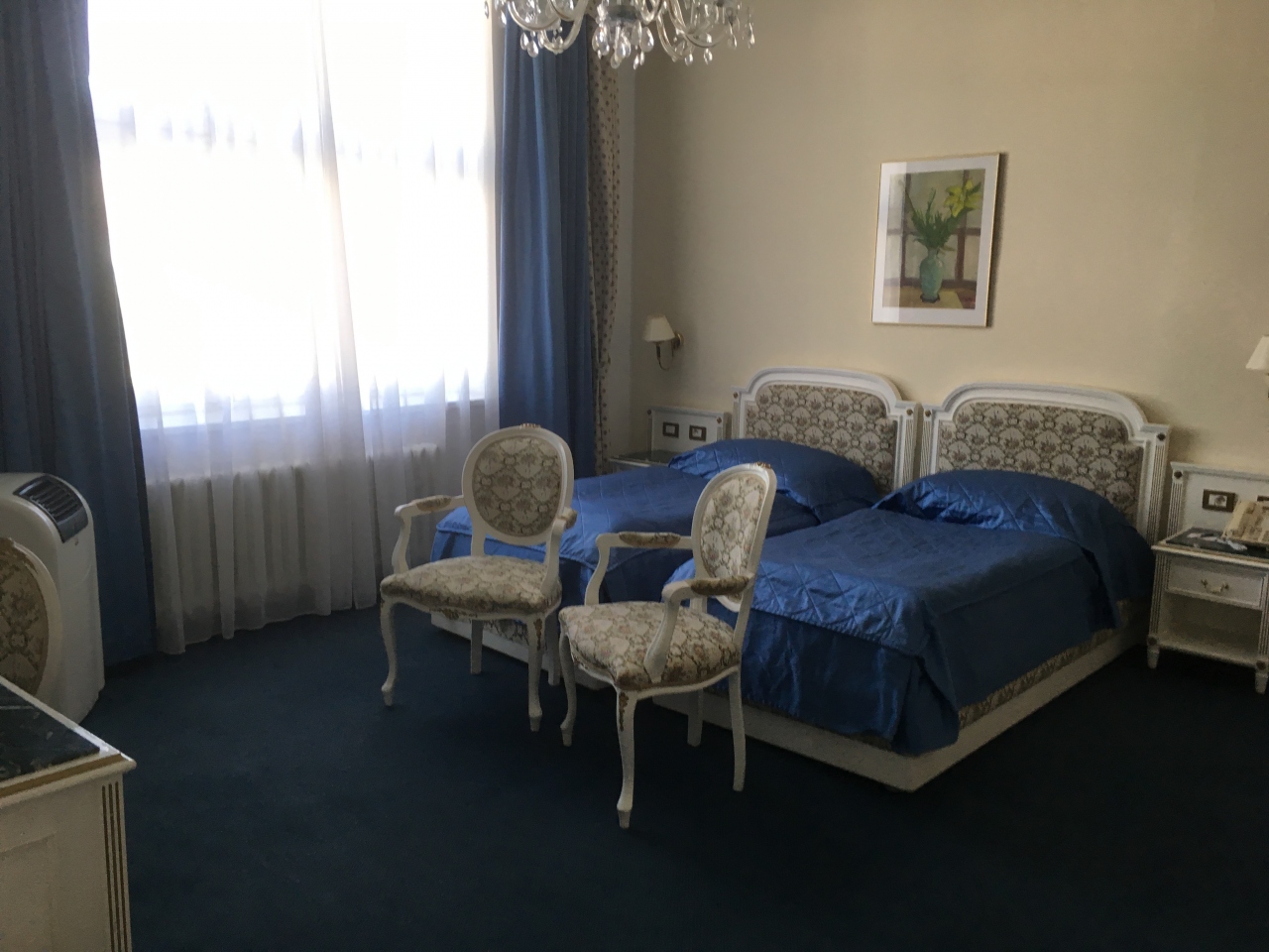部屋はとても広くて、ツインルームになっていました。部屋にはシャンデリアもあって豪華な感じでした。