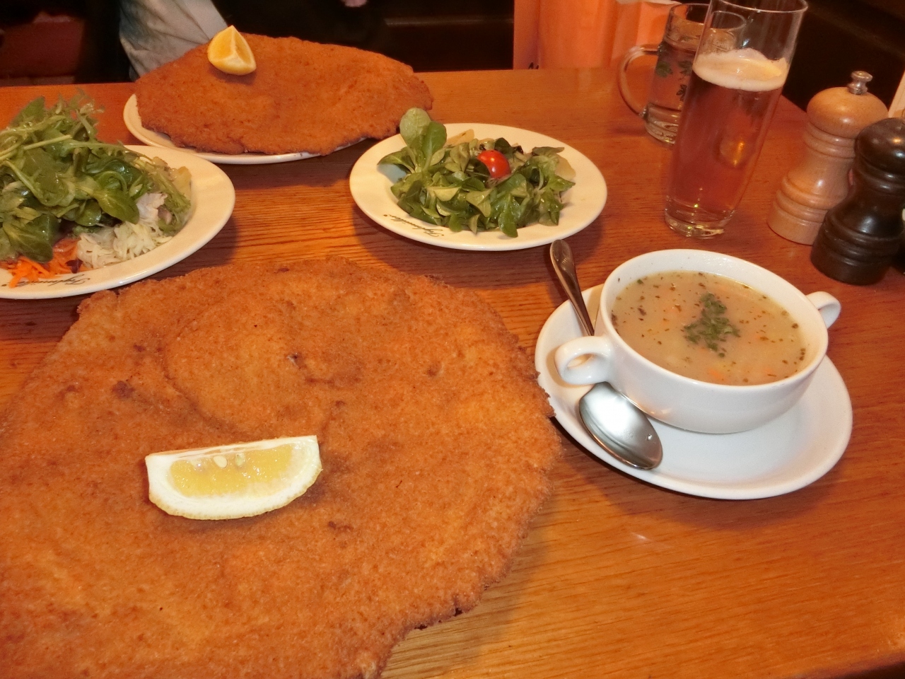 人気店ですので、日本であらかじめ予約していました。名物のヴィーナー・シュニッツェル2個とサラダ2種類、スープを3人でシェアしました。ビールとワインも注文しました。支払いはチップ込みで60ユーロでした。案外量があるので、1人1つ頼むと食べきることができませんので、ご注意ください。