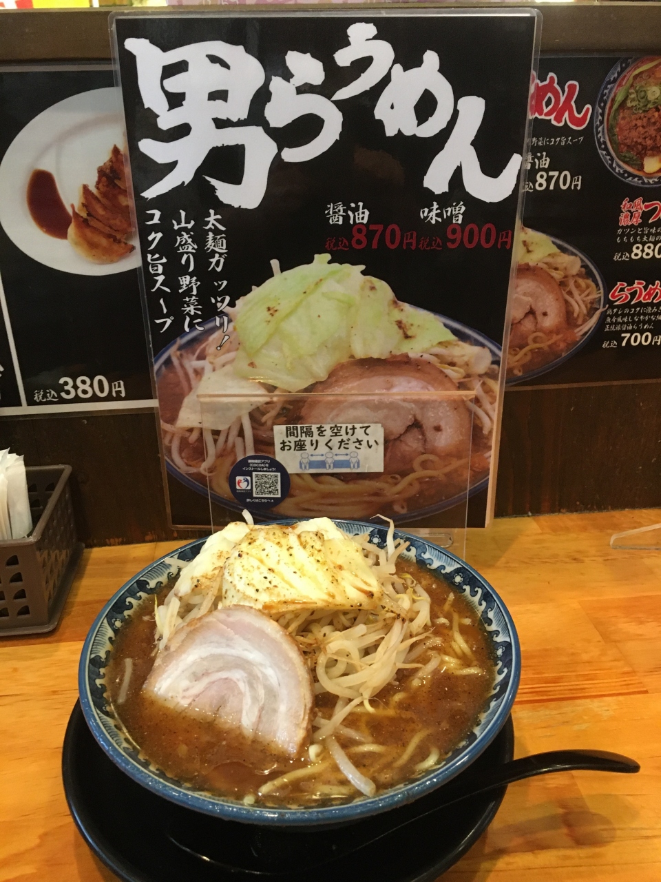 今回は男ラーメンというお野菜もたくさんの分を注文しました。醤油味870円- 旅行時期
