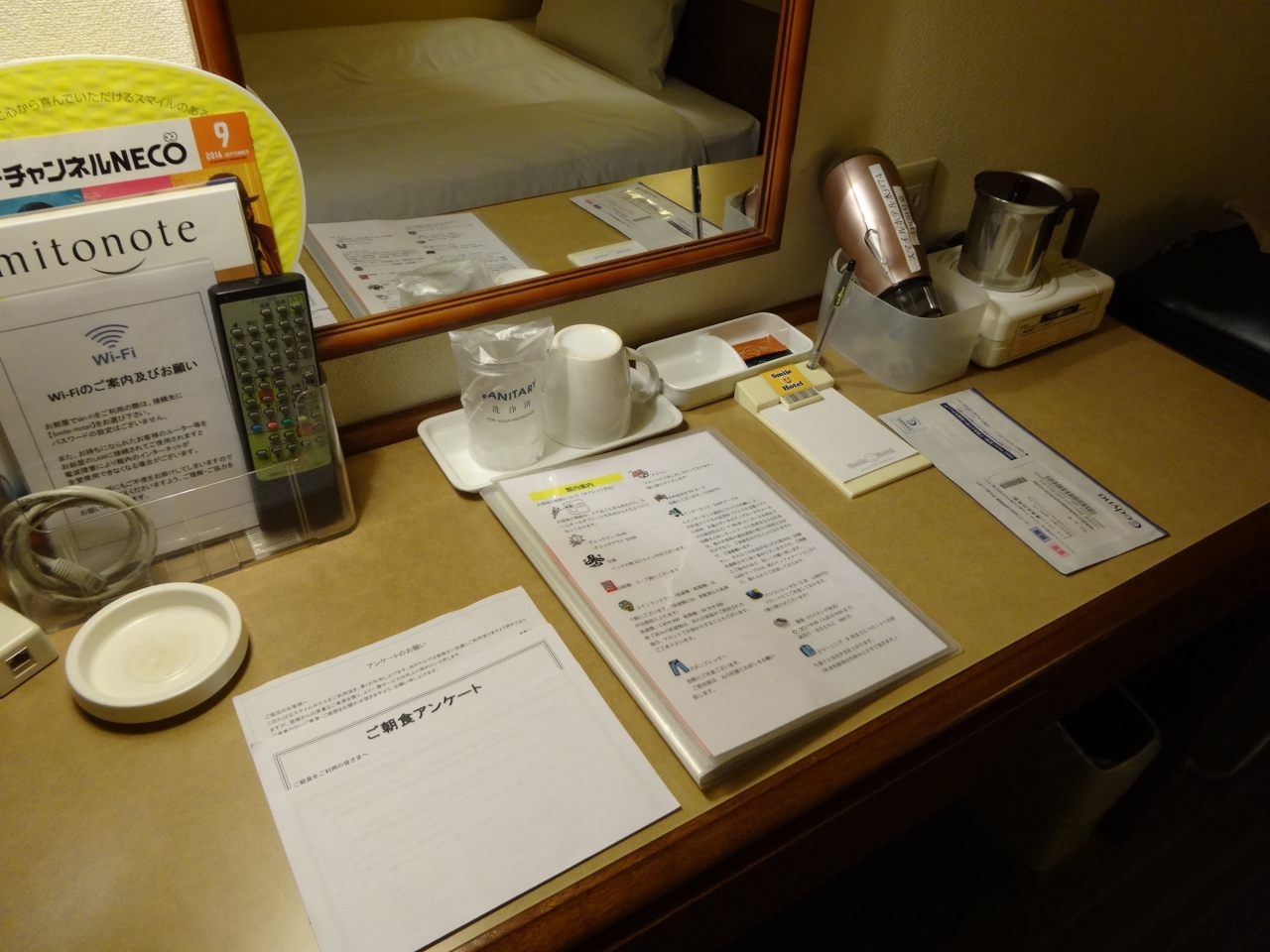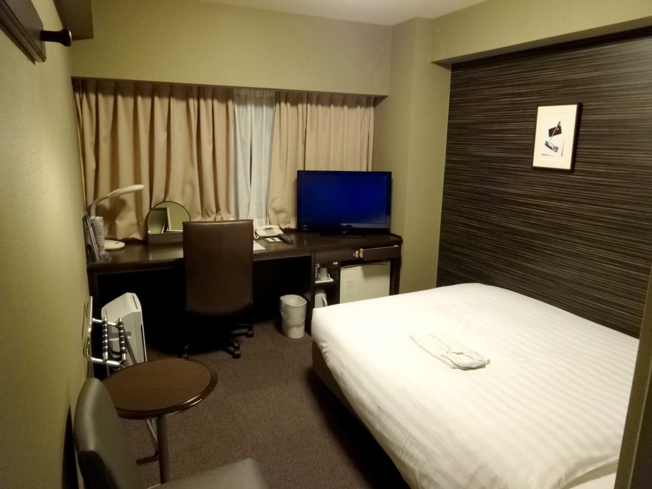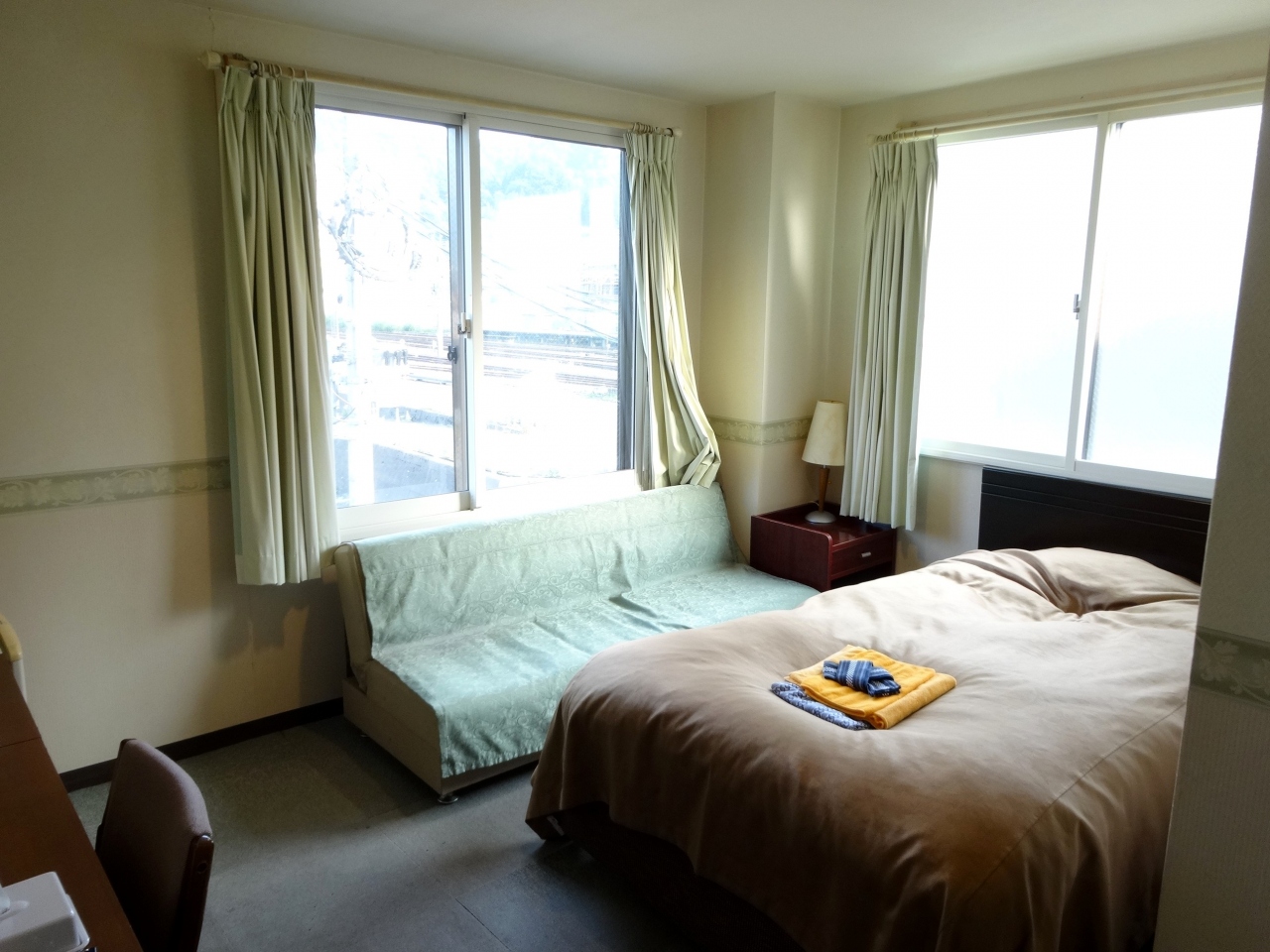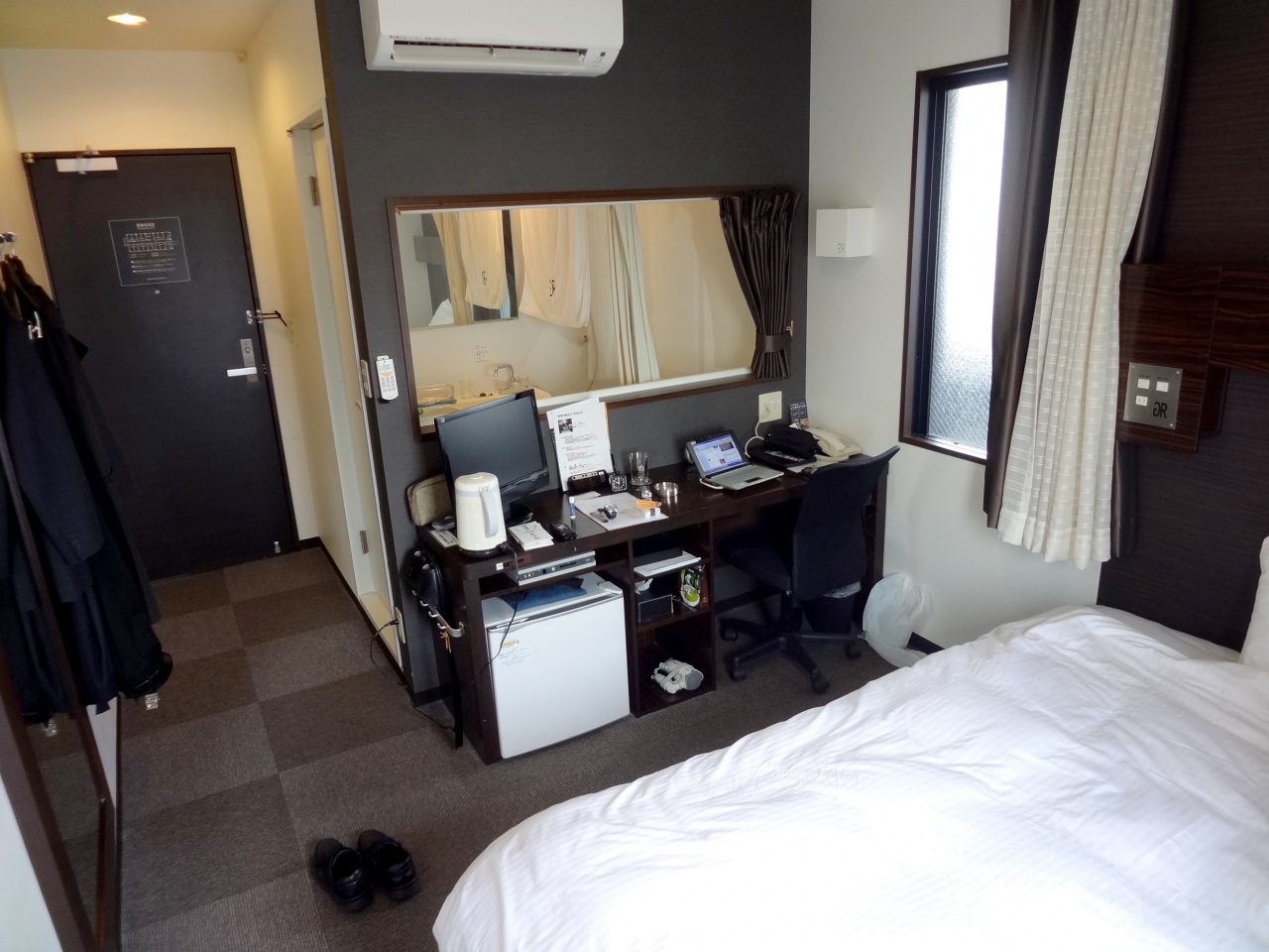 館内は清潔感に溢れており、お部屋も外光がたっぷりと入る大きい窓・ライティングデスクとビジネスユースの我々にとっては申し分ない居住性です。