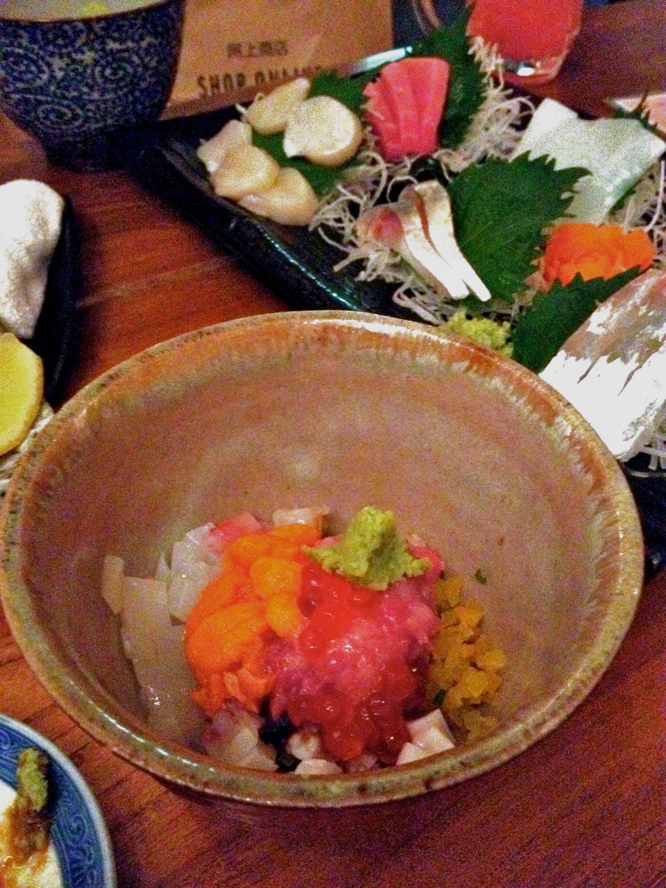 特に、看板メニューの「バクダン」は本当に最高!納豆、たくあん、うに、いくら、いか、中落ちが贅沢に入っていて、お醤油とわさびでよくかき混ぜて食べます。正直これとご飯だけでいくらでもいけると思いました。