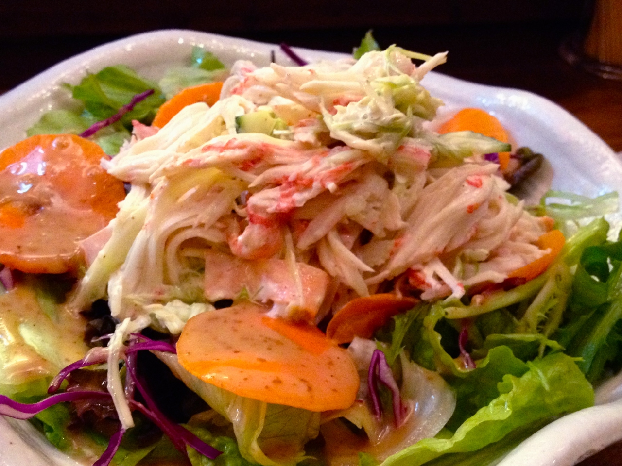 私たちが注文したのは、もずく酢、刺身の盛り合わせ、お寿司、かにサラダと「バクダン」、締めに緑汁とかなりお腹いっぱいの品々です。