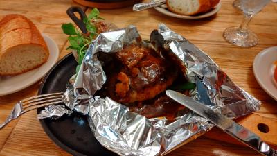 ハンバーグにビーフシチューのお肉の一片を乗せアルミニュームホイルで包み焼した商品。