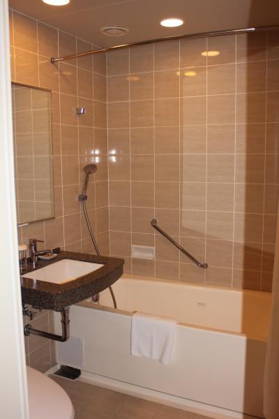 - 十分足が伸ばせる浴槽です。バスロープも備えてありました、勿論鏡も曇りません