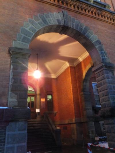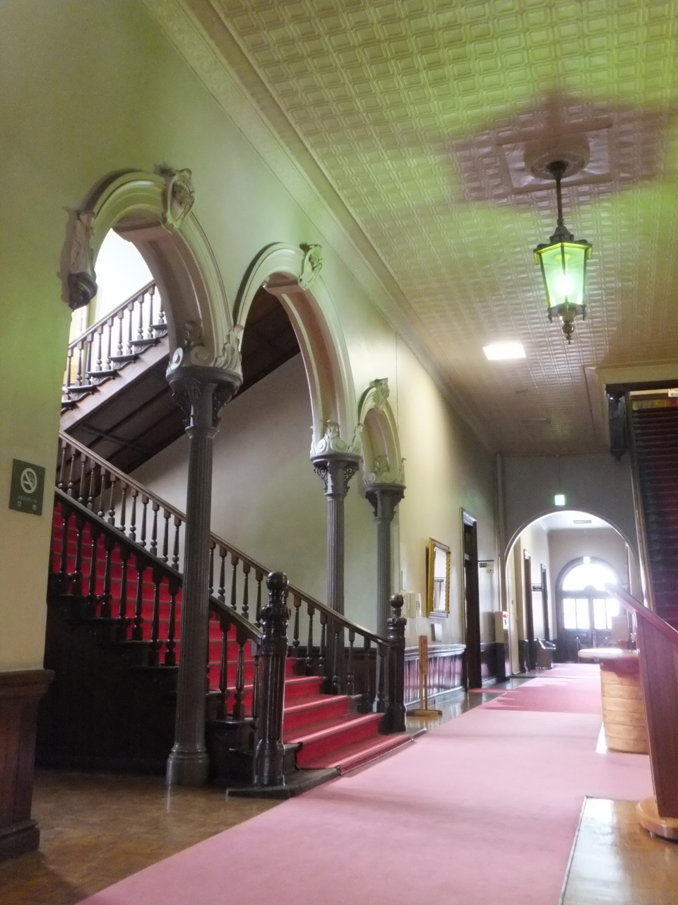 外観は明治時代の洋風建築でどっしりとした感じをうけます。赤れんがと天然スレートの屋根が素敵です。