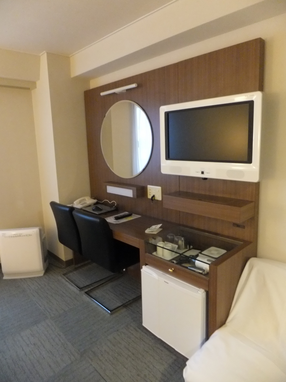 ツインルームも広くテレビの横のテーブルが動かせます。二人でそのテーブルを囲みました。お部屋には加湿空気清浄器もありました。