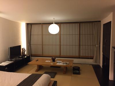 部屋は、カウチソファと低床ベッドの並ぶ16畳の和室。