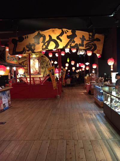 昭和レトロの雰囲気が漂う「じゃわめぐ広場」を散策して、夕食は地元の食材をつかった和食中心のバイキングで、満腹状態に。