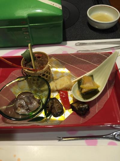 夕食は3階の「料理茶屋」にて、量は多く、味も文句ないのだが、出される順番が献立と異なっていたり、スムーズにお茶が出てこなかったりと、どこかしらチグハグな印象が残ったのが残念。