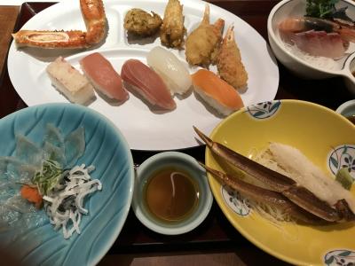 カニ刺し、ふぐ刺し、カニ爪、焼きガニ、刺身、寿司に始まり、牛ステーキ、カニシューマイ、カニサラダ、カニ足、ふぐ鍋、天ぷら、カニ飯、茶碗蒸しまで、90分間の制限時間一杯を使って、料理を満喫。- 旅行時期