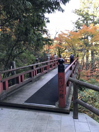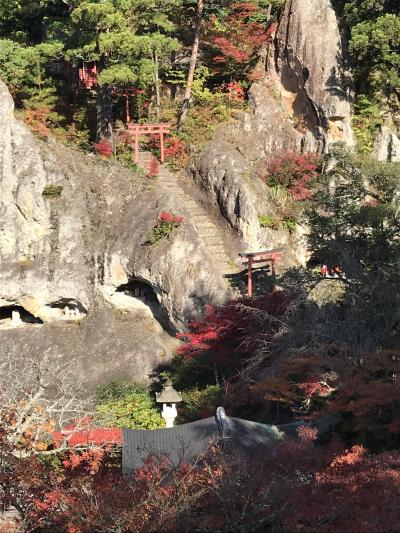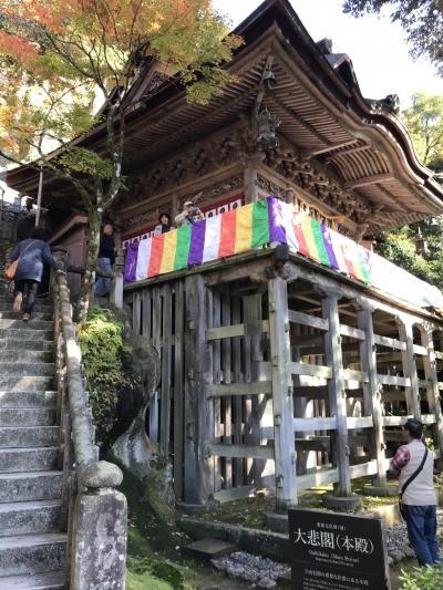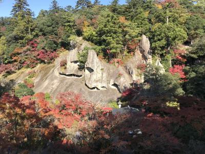 寺院の中に入ると、参道の周りの木々は赤や黄色に彩られており、ポスターにでてくる「奇岩遊仙境」の神秘的な姿が眼前に。石段を上がって本殿「大悲閣」へ。そこから、山腹の道を通って、三重塔、楓月(ふうげつ)橋から、展望台に辿り着く。ここからの奇岩遊仙境の眺めは圧巻。