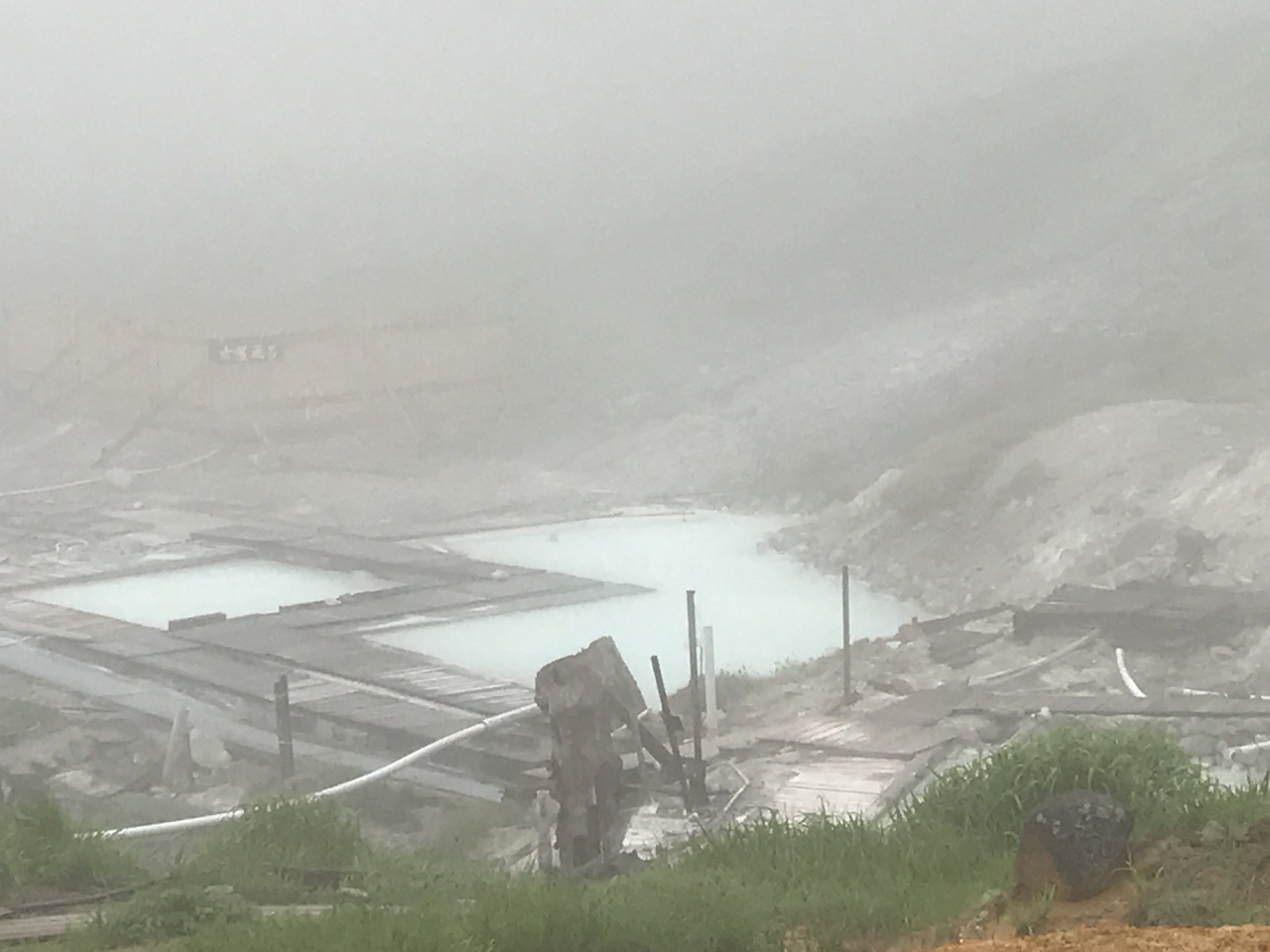 そこには、かすかに噴煙を上げた荒涼とした風景が広がっていて、そこに木造りの露天風呂が4つ。
