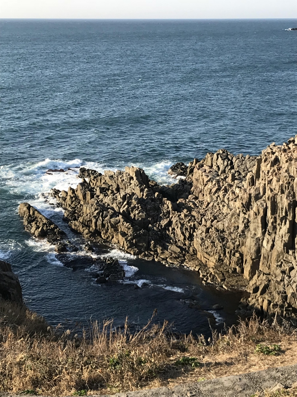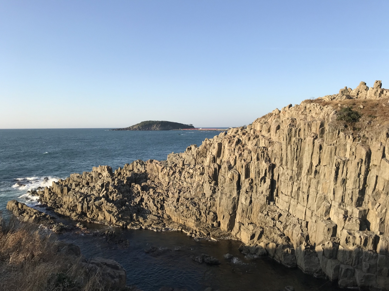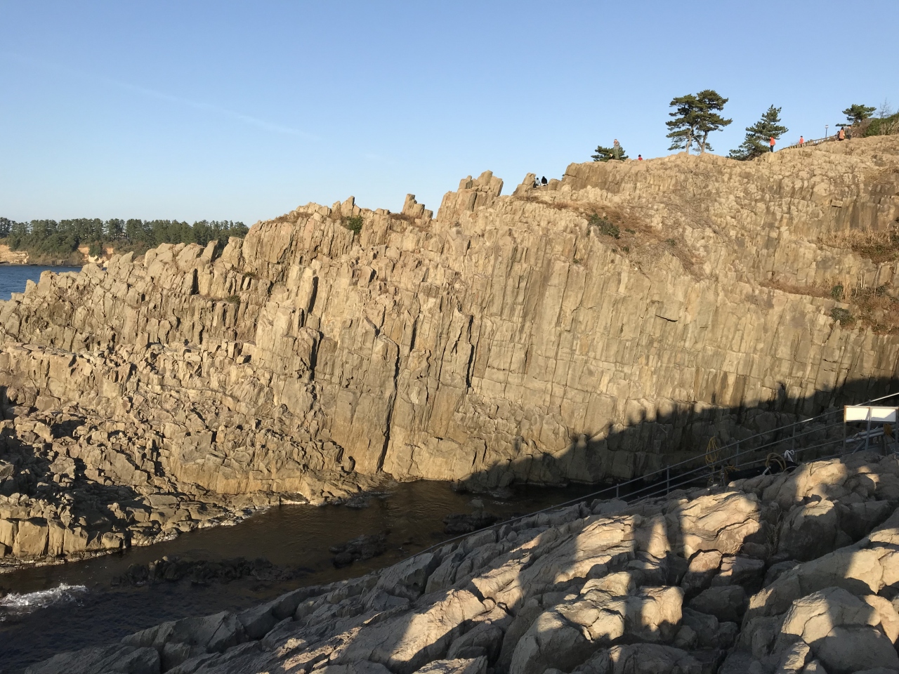 断崖絶壁が1キロ以上にわたって続く景観は、「輝石安山岩の柱状節理」という世界的にも珍しいものだそうだ。