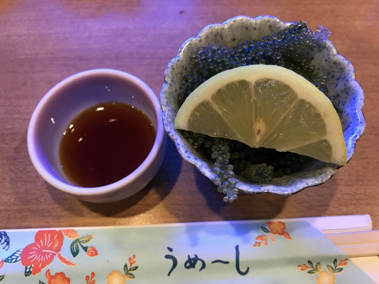 まずは、沖縄へ来てからまだ口にしていない、オリオンビールと海ぶどうを注文しようとしたら、店員さんから「どうやってこの店のことをお知りになりましたか?」と聞かれ、食べログで検索してきたと答えると、「海ぶどうをサービスさせていただきます。」との思いもかけない返事!