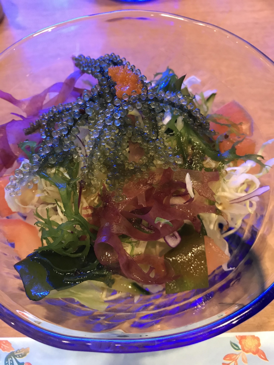 久々に食べる海ぶどうは、ぷりっぷりの食感で、やはりこれは本場に来ないと食べられない味だと再認識。刺身の盛り合わせ、サラダ、天ぷらと注文したが、量・質ともに満足。- 旅行時期