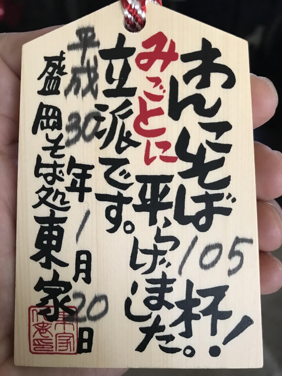 店員さんの説明では、成人男子の平均が50~60杯程度だそうで、100杯食べると「手形」がもらえるのだとか。まさか、そこまでは無理だろうと、次々に運ばれるそばを食べていたら、いつの間にか、成人男子平均を軽く超え、ついに105杯で終了。