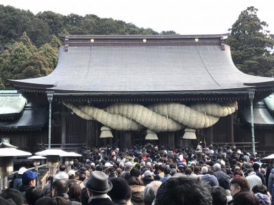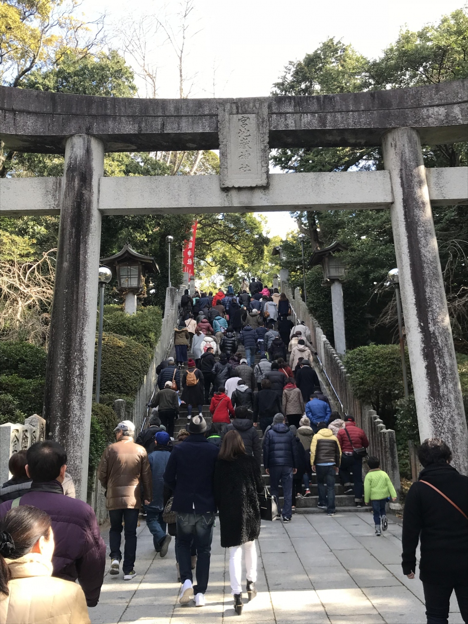 さて、今回も、駐車場待ちの車で、神社付近の道はグーグルマップ上真っ赤になっており、JR福間駅からを出て間もなく渋滞の列を横目に、30分かけて神社に向かう。「例の」階段を上って境内に入ると、予想以上の初詣客がいて、参拝するまで15分程度かかった。