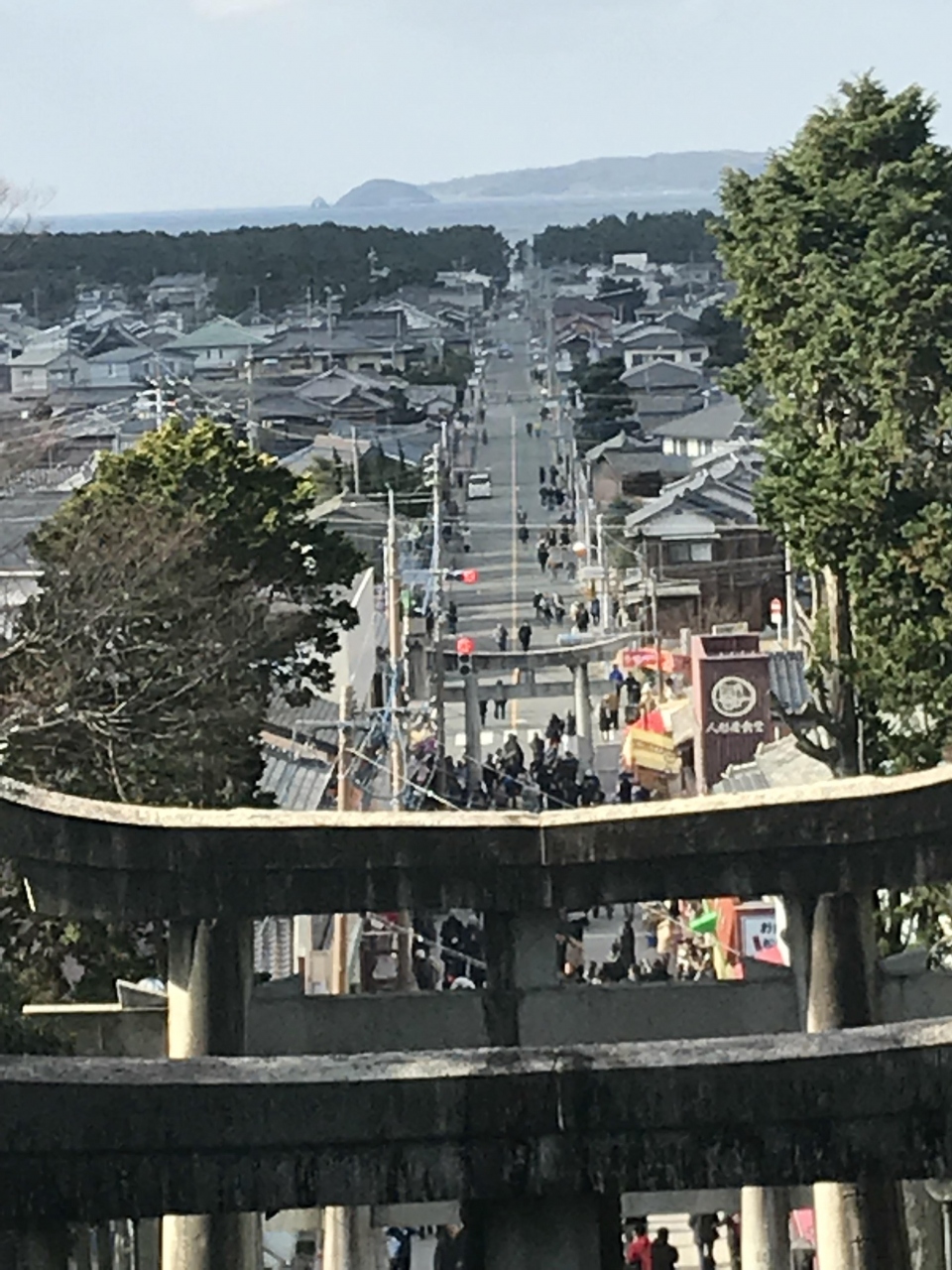 さて、今年は「宮地嶽神社」。これまで聞いたことがないが、結構有名なところだとか。神社に向かう階段を登り切ったところから振り返ると、海に向かって道が一直線に伸びていて、年に2回夕陽を沈む瞬間に、そこが「光の道」に見えるのだそうで、嵐が出演したJALのCMで一躍有名になったらしい。