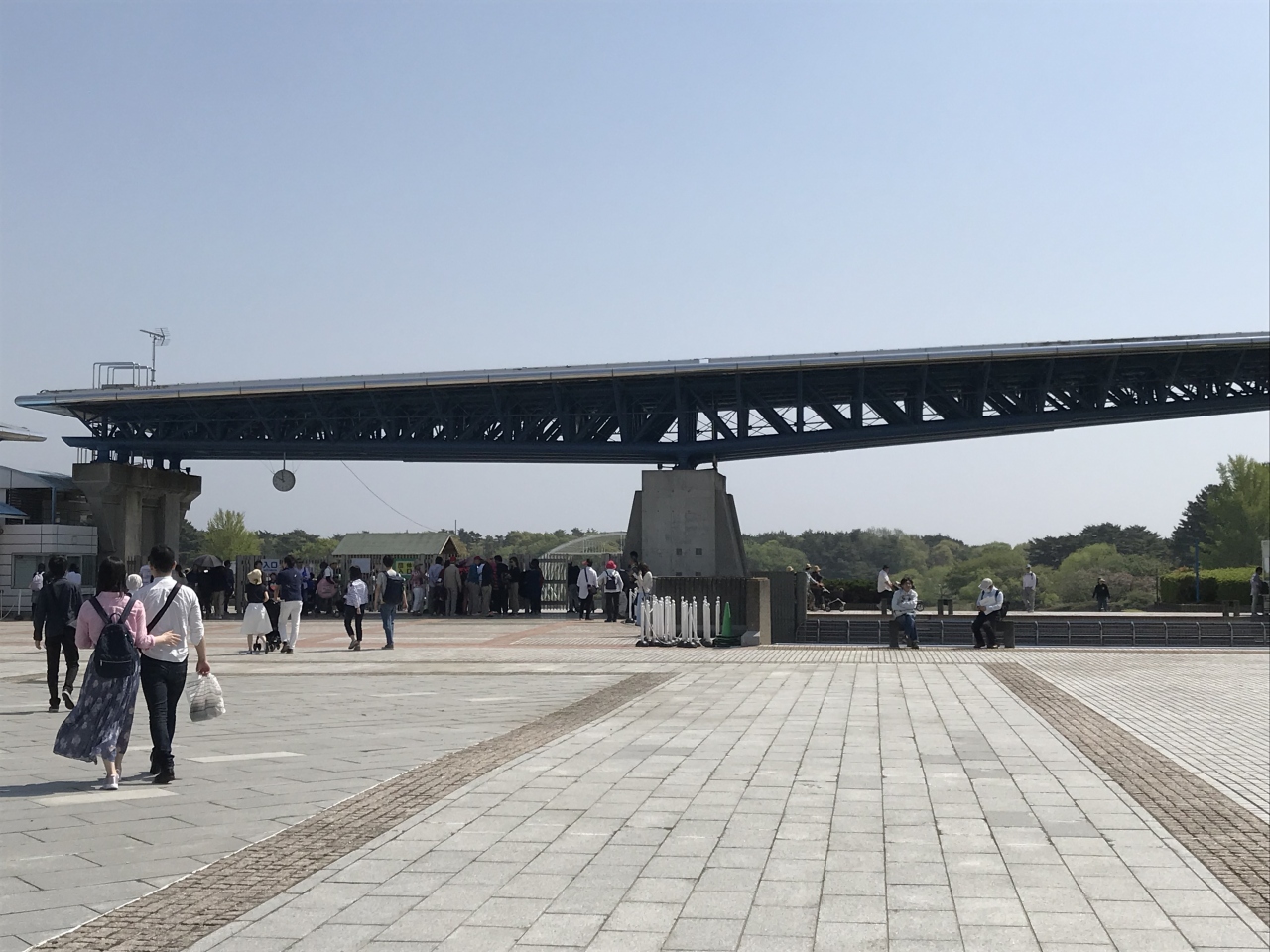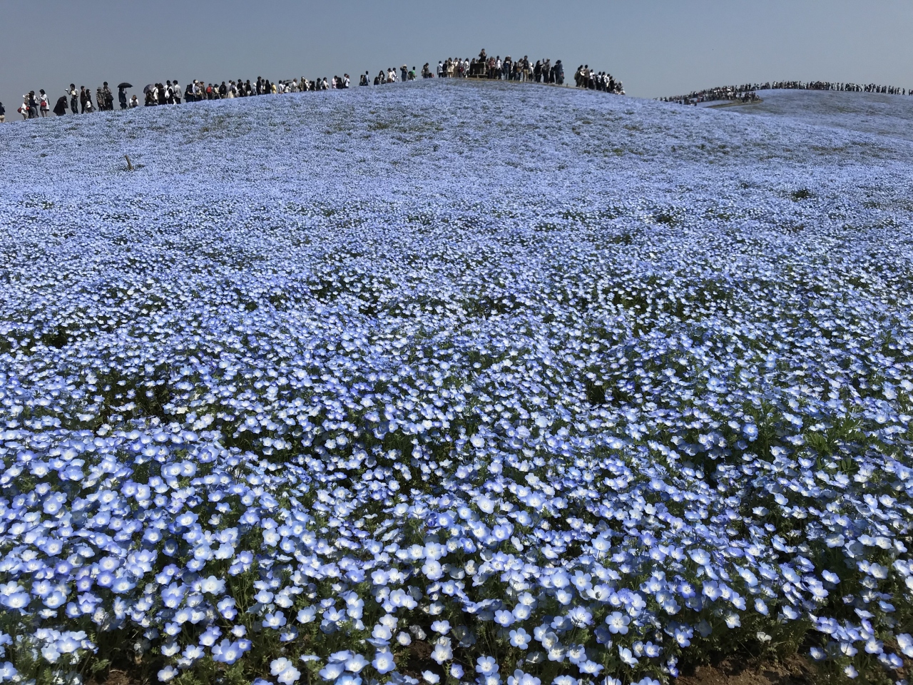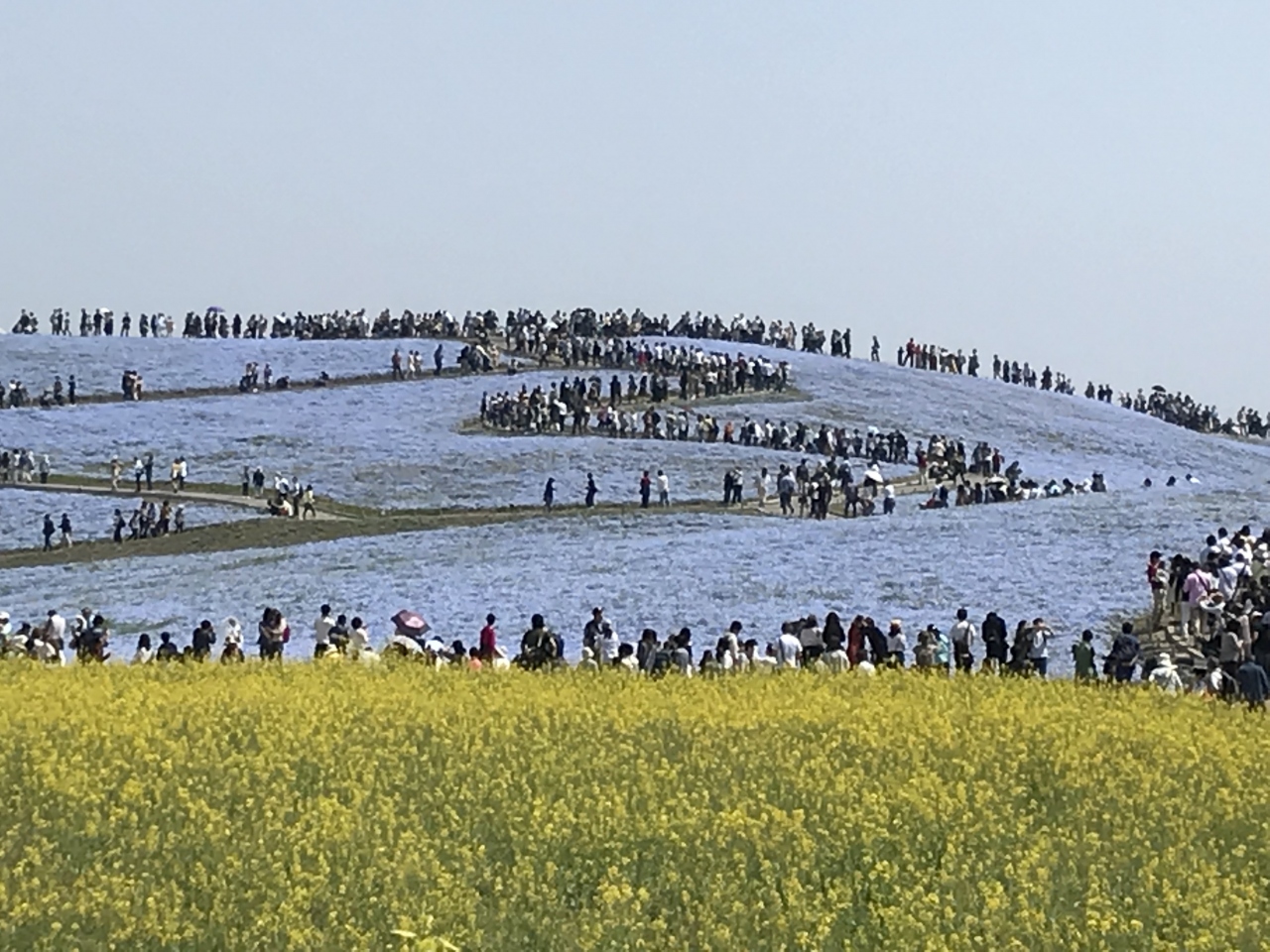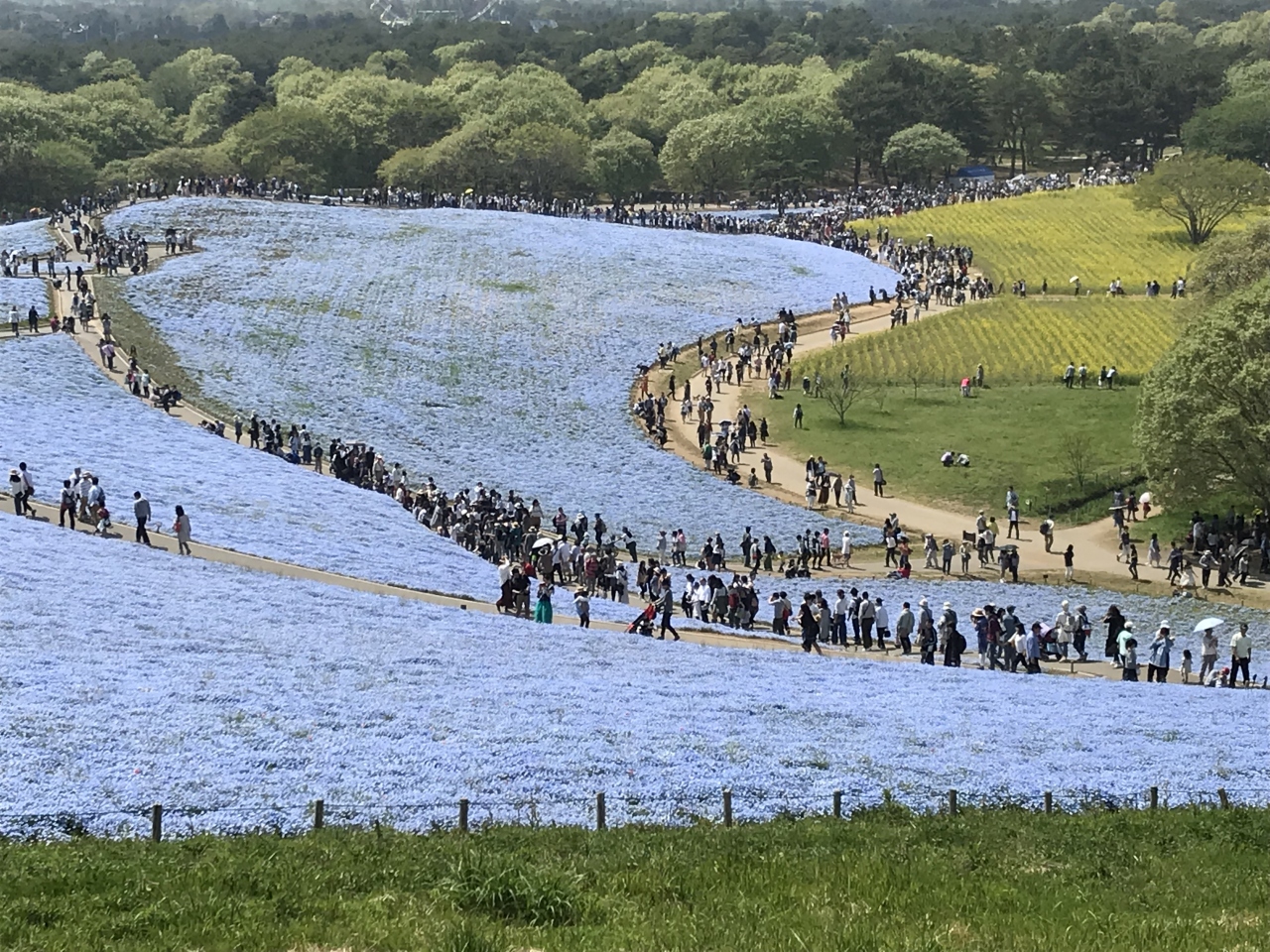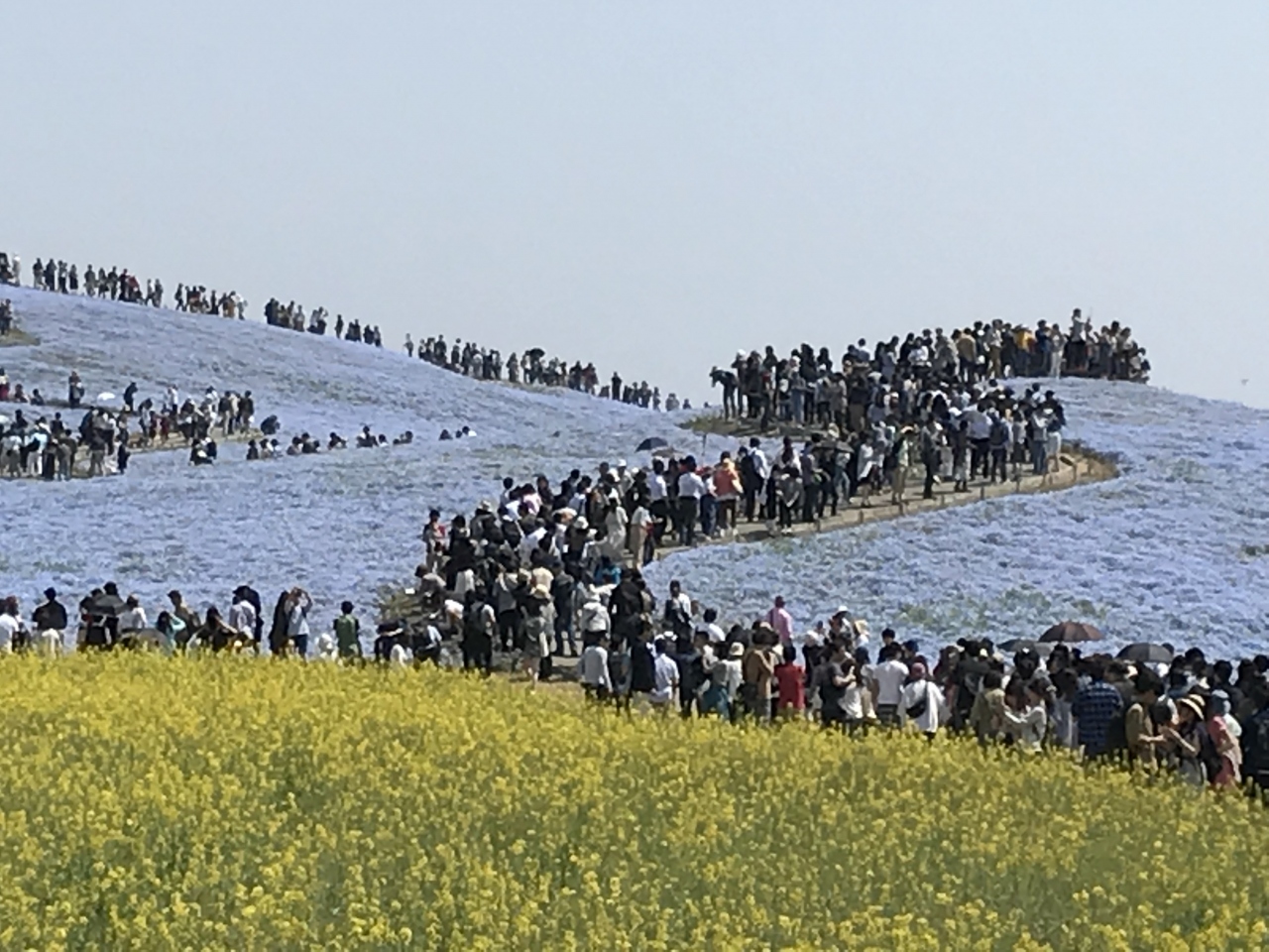 GW期間中は早朝開園日となる7時半からの開園となるようですが、この日は通常通りの9時半開演。土浦駅からシャトルバスでひたち海浜公園に到着した時は、開園30分後の10時頃でしたが、ネモフィラの咲く「みはらしの丘」へ向かいう道は、まるで初詣の参道のように、ごった返していました。