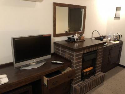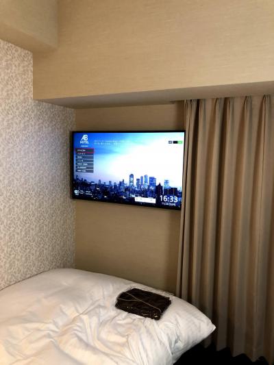 部屋は狭いが、壁掛けテレビは49型と大きい。