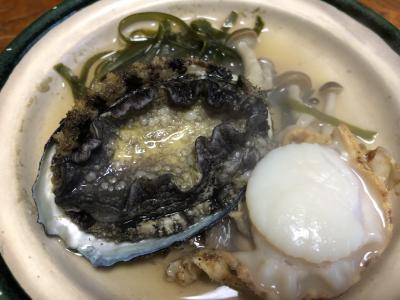 夕食は部屋出しで、テーブルの上にところ狭しと海鮮尽くしの器が並ぶ。お造りはもちろんのこと、殻付きのウニや鮑と帆立の踊り食いなど。